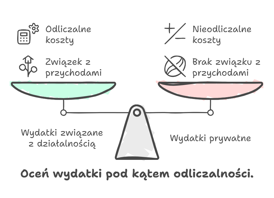Co więc może być kosztem? Takie wydatki, które są ściśle powiązane z uzyskanymi przez Ciebie przychodami. Między kosztem a przychodem musi istnieć związek przyczynowo-skutkowy. Nie możesz odliczyć rzeczy lub usług zakupionych do celów prywatnych. Do kosztów zaliczysz tylko te rzeczy, usługi, które wykorzystujesz w swojej działalności. Pamiętaj, że to na Tobie ciąży obowiązek udowodnienia związku pomiędzy poniesionym kosztem, a przychodem oraz obowiązek udowodnienia, że taki wydatek miał miejsce.
